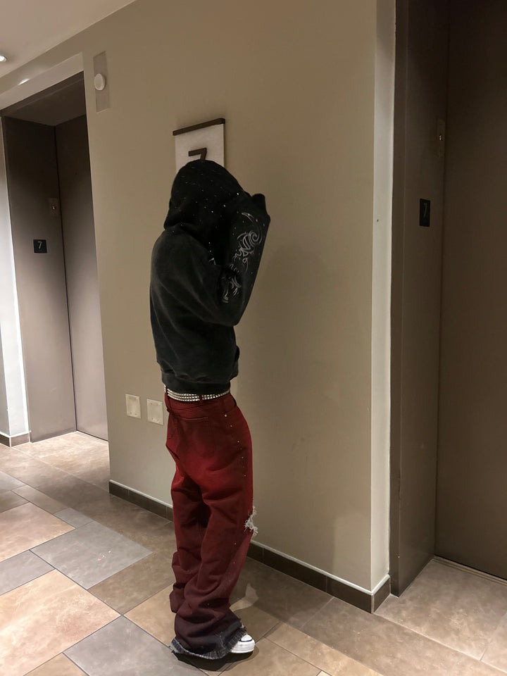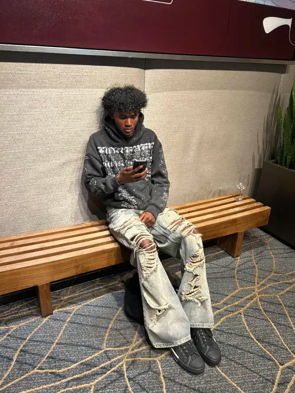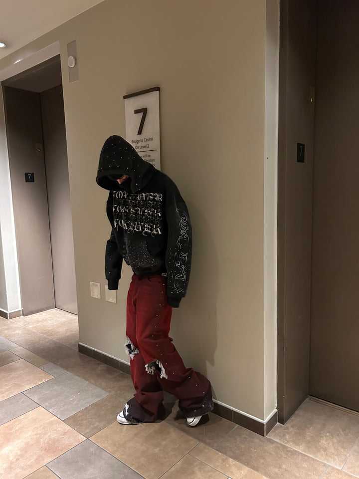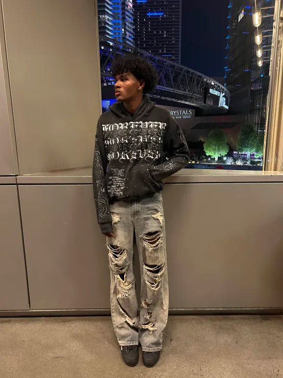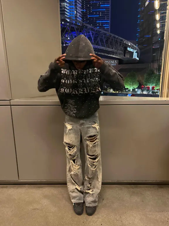 Look: Dark grey acid wash, rhinestones + screen print